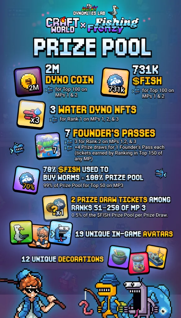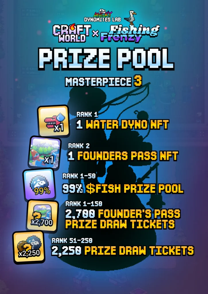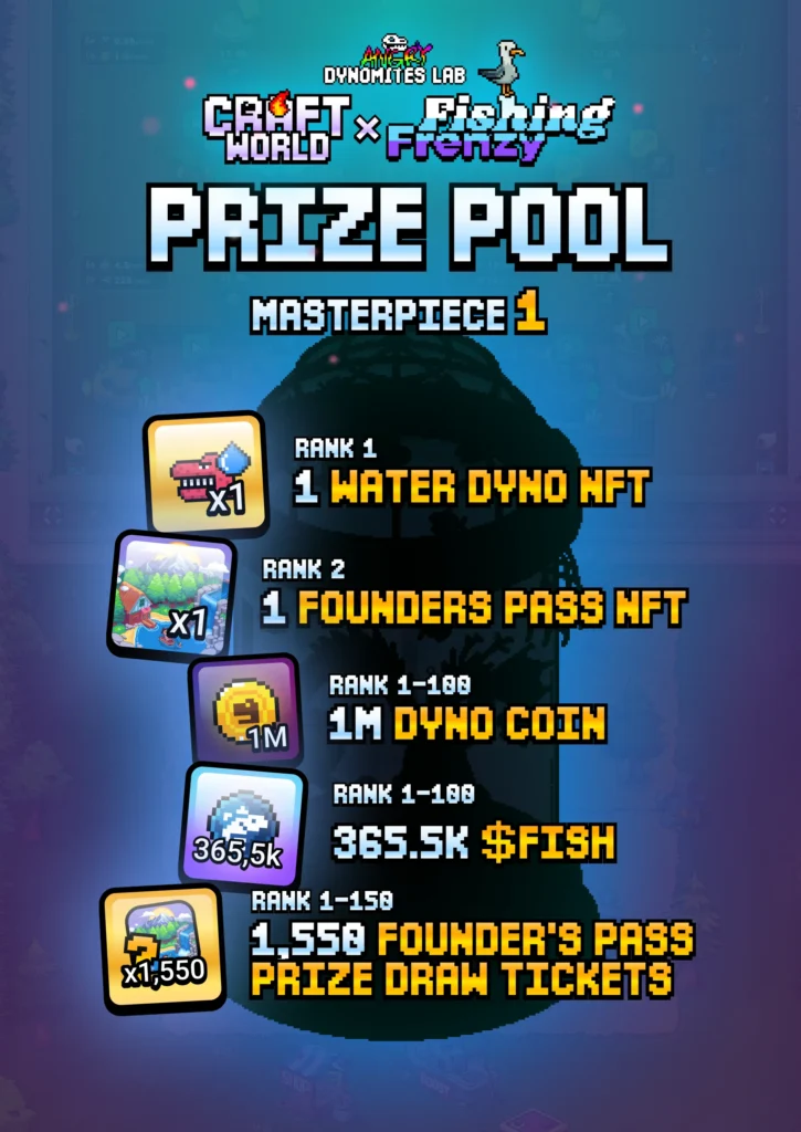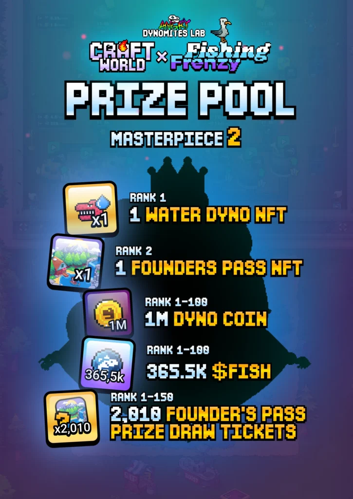 The event offers a massive prize pool, including 7 Founders Pass NFTs, 3 Water Dyno NFTs, 731K $FISH, and 2M Dyno Coin.